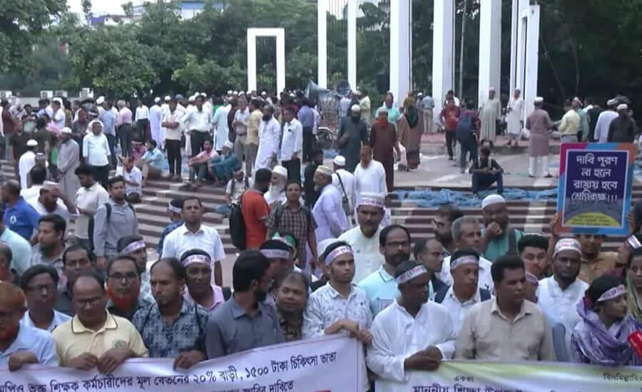 সরকারের ঘোষিত বাড়ি ভাড়া ভাতা মূল বেতনের ৫ শতাংশ বা ন্যূনতম ২ হাজার টাকা নির্ধারণের সিদ্ধান্ত প্রত্যাখ্যান করে রাজধানীর কেন্দ্রীয় শহীদ মিনারে মহাসমাবেশ ও অবস্থান কর্মসূচি পালন করছেন এমপিওভুক্ত শিক্ষকরা।