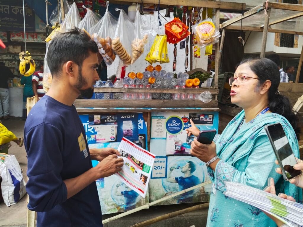 আজ ১৫ অক্টোবর ২০২৫, ঢাকা সিভিল সার্জন অফিসের সিনিয়র স্বাস্থ্য শিক্ষা কর্মকর্তা শাহানা পারভীন এর নেতৃত্বে ঢাকা মেডিকেল কলেজ হাসপাতাল সংলগ্ন এলাকার তামাকজাত দ্রব্য বিক্রয়কেন্দ্রগুলোতে বিজ্ঞাপন অপসারণ অভিযান পরিচালিত হয়। এসময় দোকান মালিক ও সাধারণ জনগণকে তামাক নিয়ন্ত্রণ আইন ও এই আইন লঙ্ঘনের শাস্তি সম্পর্কে অবহিত করা হয়। পাশাপাশি এই সংশ্লিষ্ট লিফলেট বিতরণ করা হয় এবং বিক্রয়কেন্দ্রগুলোতে নো-স্মোকিং সাইনেজ লাগানো হয়।