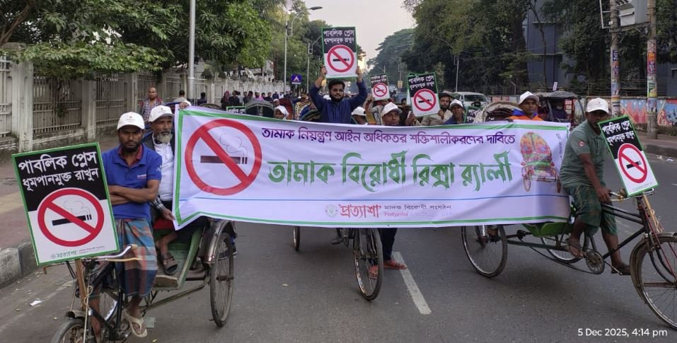 শুক্রবার (০৫ ডিসেম্বর ২০২৫) বিকেলে প্রত্যাশা মাদক বিরোধী সংঠনের উদ্যোগে আয়োজিত তামাক নিয়ন্ত্রণ আইন দ্রুত সংশোধনের দাবিতে রিক্সা র্যালিতে তামাক নিয়ন্ত্রণ বিশেষজ্ঞরা এসব কথা বলেন। র্যালিটি কেন্দ্রীয় শহীদ মিনার থেকে শুরু হয়ে শাহবাগে গিয়ে শেষ হয়। প্রত্যাশা মাদক বিরোধী সংঠনের সাধারণ সম্পাদক এবং বাংলাদেশ তামাক বিরোধী জোটের ভারপ্রাপ্ত সমন্বয়কারী হেলাল আহমেদের সভাপতিত্বে র্যালিতে বক্তব্য রাখেন, স্থানীয় সরকার বিশেষজ্ঞ শাগুফতা সুলতানা, ডাস্ এর টিম লীড আমিনুল ইসলাম বকুল, পরিবেশ কর্মী আবু নাসের অনীক, তামাক নিয়ন্ত্রণকর্মী আবু রায়হান এবং বিভুতি ভূষণ। অবস্থান কর্মসূচিতে আরো উপস্থিত ছিলেন প্রায় শতাধিক রিকশাচালক।
